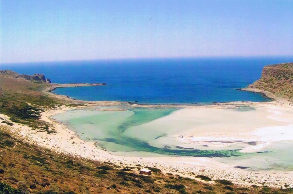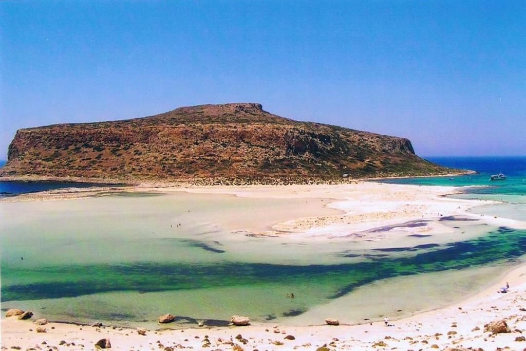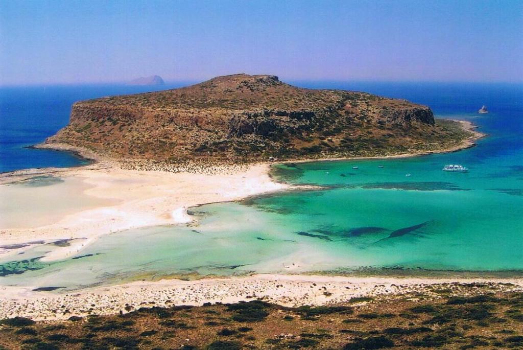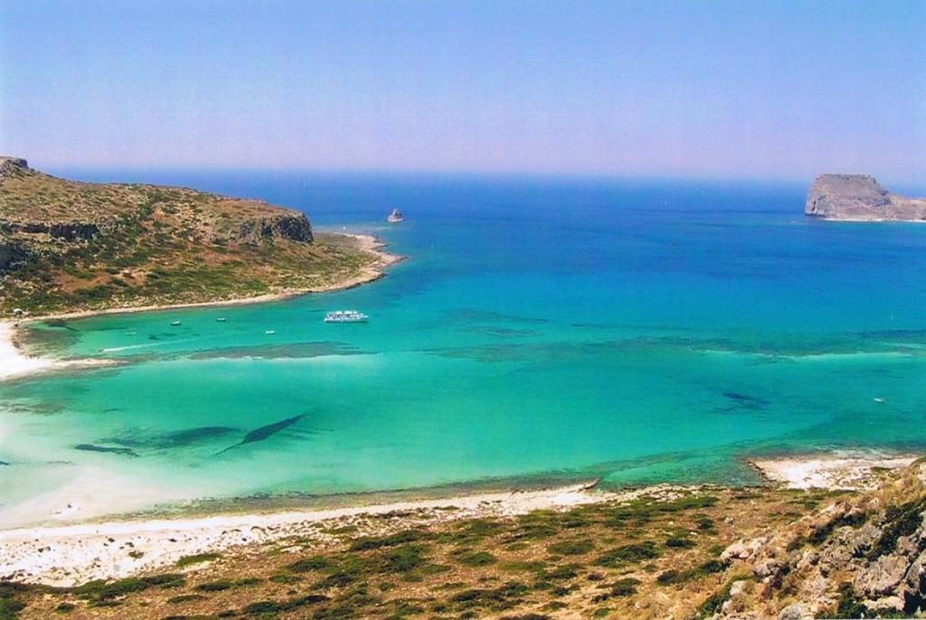 De l’autre côté s’élève la Presqu’ile de Tigani. Le lagon s’ouvre sur la Baie de Balos (à droite).