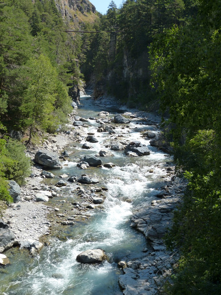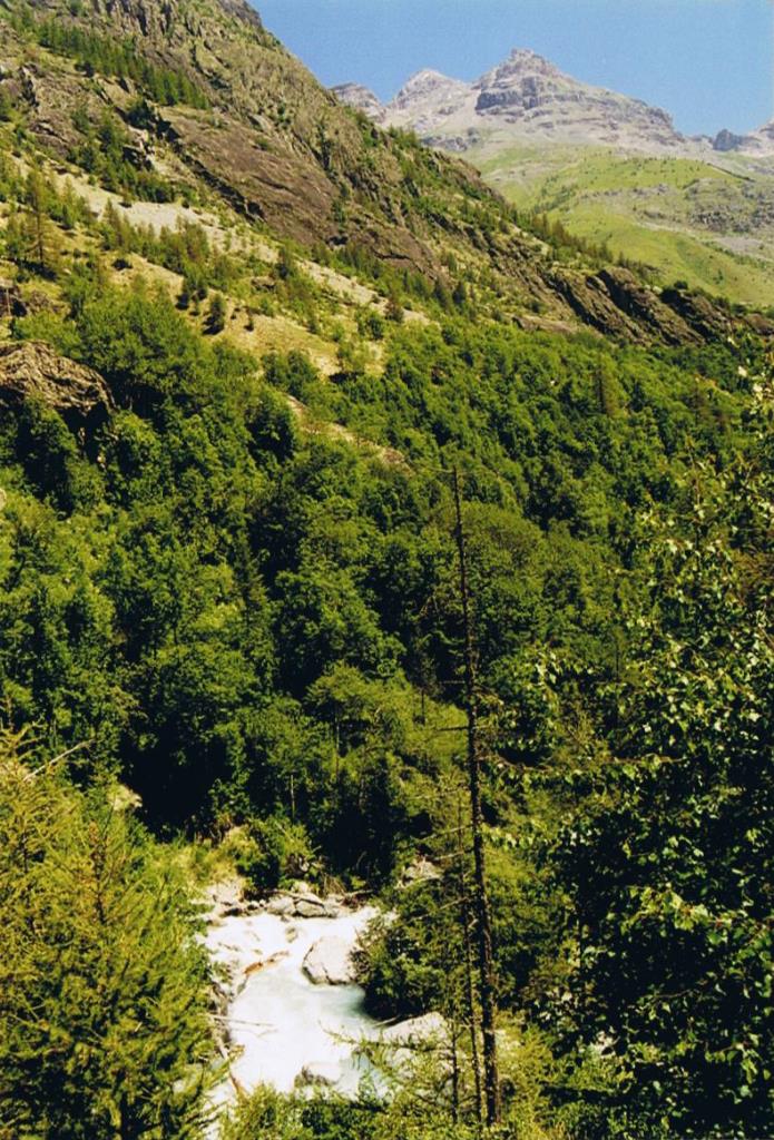En été, le Parc national des Ecrins (à gauche - Photo Nathalie Donadille, juillet 1997 : Vallée de la Vallouise) vous offrira une multitude de promenades de tous niveaux au coeur d’une nature encore préservée, tout comme les vallées du Parc naturel régional du Queyras (à droite, les combes du Guil, sous Château-Queyras (Château-Ville-Vieille) - Photo Nathalie Donadille, 30 juillet 2016).
