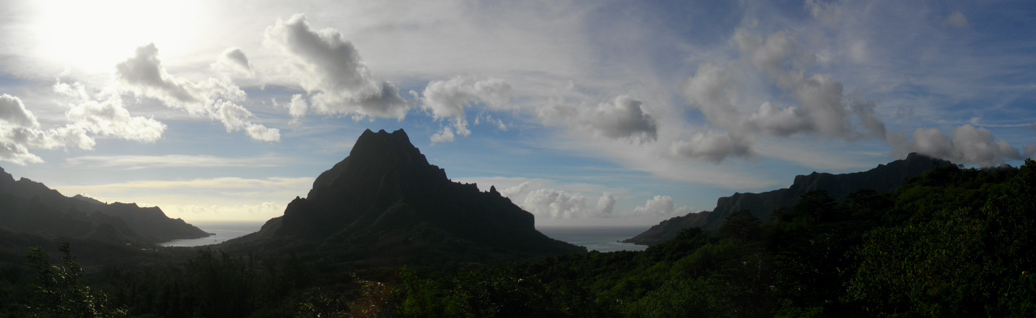 Le Mont Rōtui sépare les baies d’Ōpūnohu (à gauche) et de Cook (à droite)