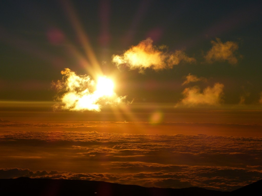 Coucher de soleil sur une mer de nuages depuis la Mauna Kea Forest Reserve. à plus de 4000 m d’altitude