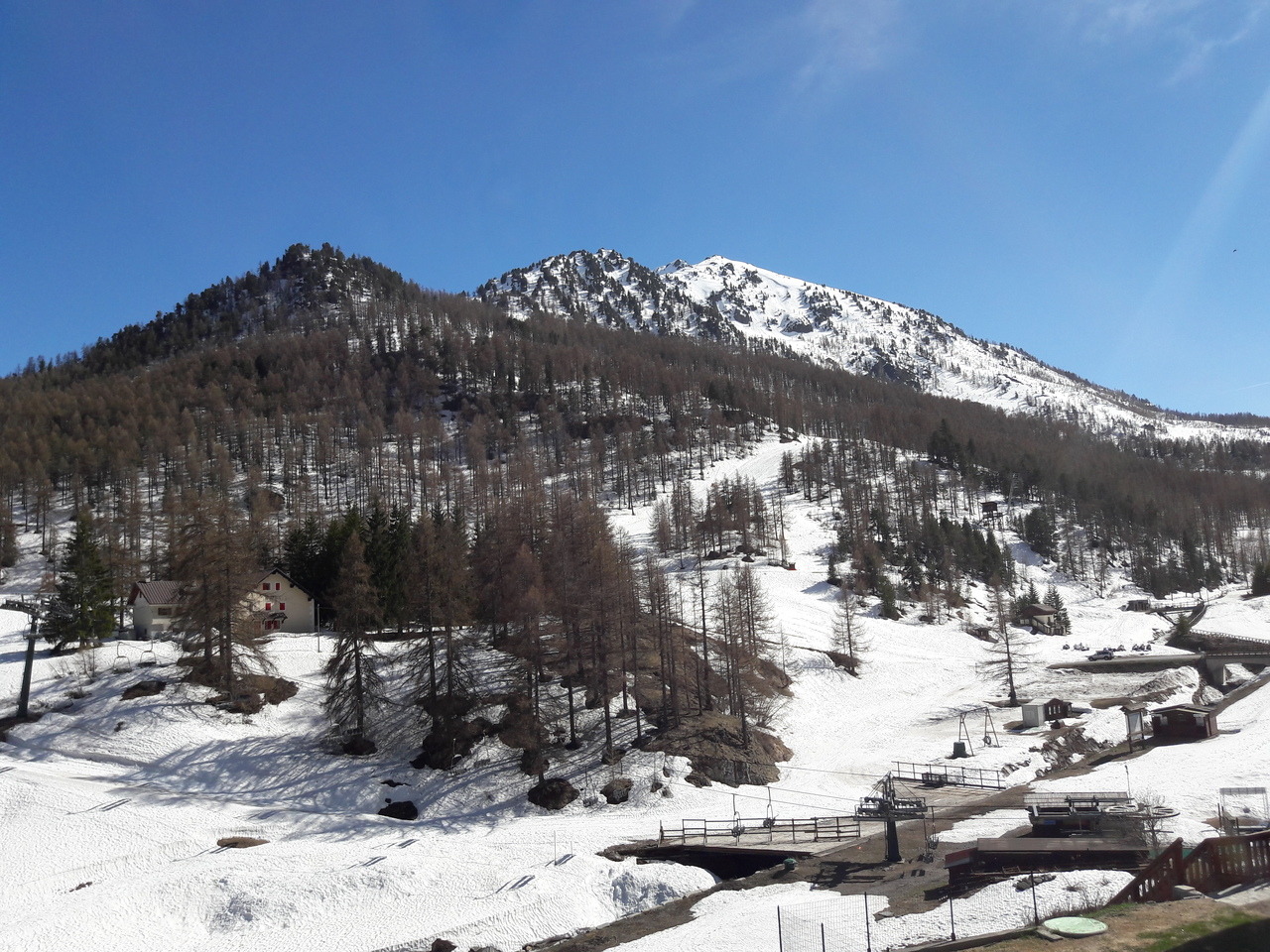 Domaine skiable franco-italien de la Voie Lactée*, côté Massif du Queyras : au premier plan, Clavières (Claviere en italien), et au second, Montgenèvre, la frontière traversant le paysage approximativement au milieu