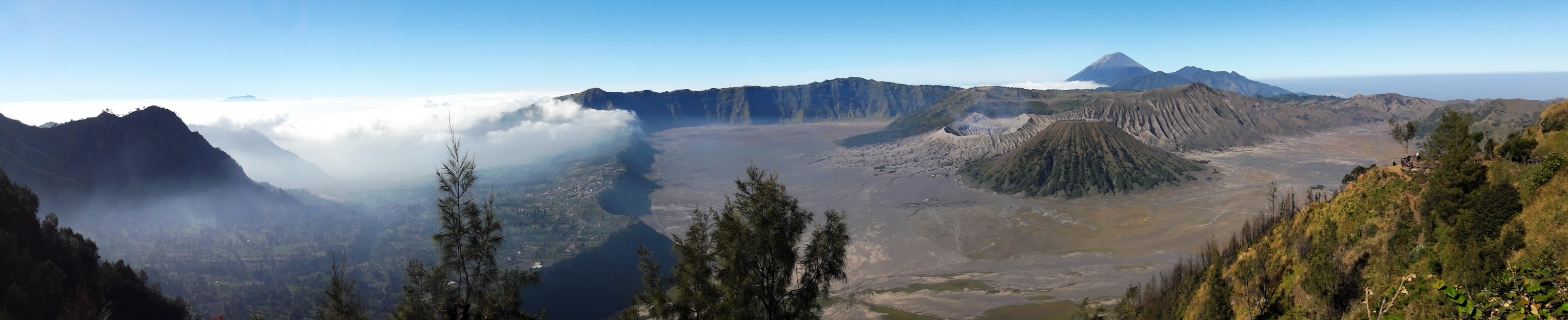 La caldera avec ses cônes et sa mer de sable, ainsi que le Gunung Semeru (en arrière-plan), le plus haut sommet de l’ile (3676 m), font partie du Parc National de Bromo-Tengger-Semeru (Taman Nasional Bromo Tengger Semeru).
