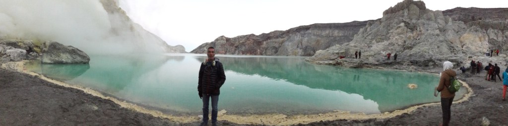 Après avoir profité de ces fantastiques paysages nocturnes, au lever du jour nous est enfin apparu le lac turquoise (ou émeraude) du cratère du Kawah Ijen (“cratère vert”, en indonésien).