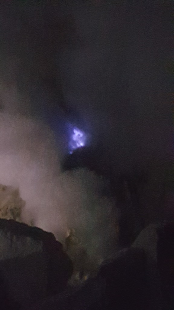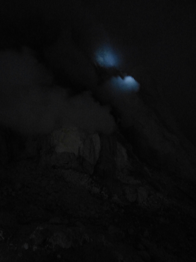 On discerne également la lueur des fameuses flammes bleues qui s’élèvent des fissures situées sur les flancs du Kawah Ijen.