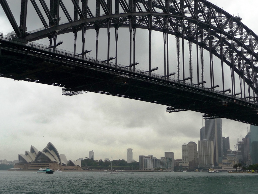 Vue depuis Milsons Point (North Sydney Council) sous le Harbour Bridge. Sur Circular Quay, on a ici Circular Quay Railway Station. A l’extrème droite, on aperçoit le Gateway Plaza et au bord de l’eau, à l’entrée de Sydney Cove Hickson Road Reserve (The Rocks) avec à sa droite, les arbres de Dawes Point Park (Dawes Point).