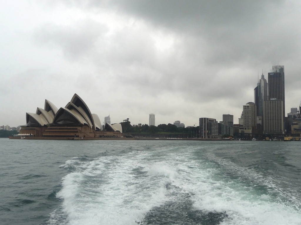 Vue depuis le ferry pour Milsons Point : à l’extrême gauche, Farm Cove, Royal Botanic Garden et Elizabeth Bay (dans le fond), puis Bennelong Point où se trouve l’opéra ; au centre, Sydney Cove bordée par l’ouest du jardin botanique duquel dépasse les tours de Government House ; en arrière-plan, l’un derrière l’autre, les quartiers de Woolloomooloo et Darlinghurst ; à droite, Circular Quay avec Circular Quay viaduct et Circular Quay Wharf (derrière lequel on voit Customs House), puis le CBD avec ses plus hautes tours : Aurora Place devant Chifley Tower et AMP Center devant Governor Phillip Tower.