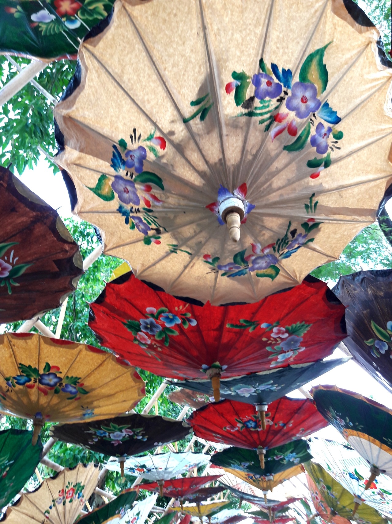 Celles-ci s’apparentent à des wagasa (ombrelle ou parapluie japonais traditionnel). Elles sont en bois, bambou et papier verni.