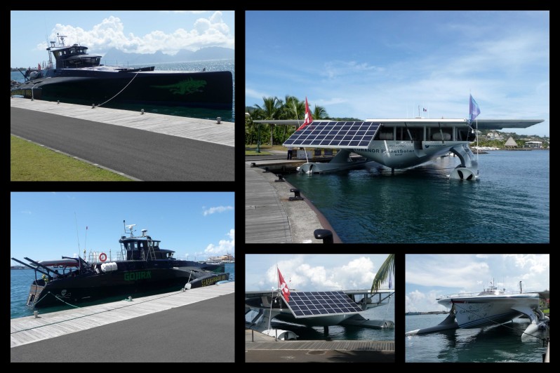 A droite sur le photomontage, c’est le PlanetSolar appartenant à la fondation éponyme helvétique, créé en 2007, qui soutient des projets liés à l’énergie solaire.