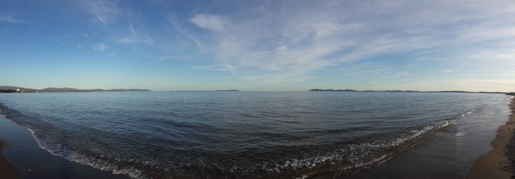 De gauche à droite, au centre de la photo : Les Salins, le Massif du Cap Bénat* face aux Iles d’Hyères (Ile du Levant, Ile de Port Cros et Ile de Bagaud qui se confondent et Ile de Porquerolles, dont on distingue le Cap et les Rochers des Mèdes), puis la Presqu’ile de Giens dans le prolongement de Porquerolles