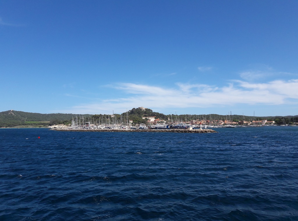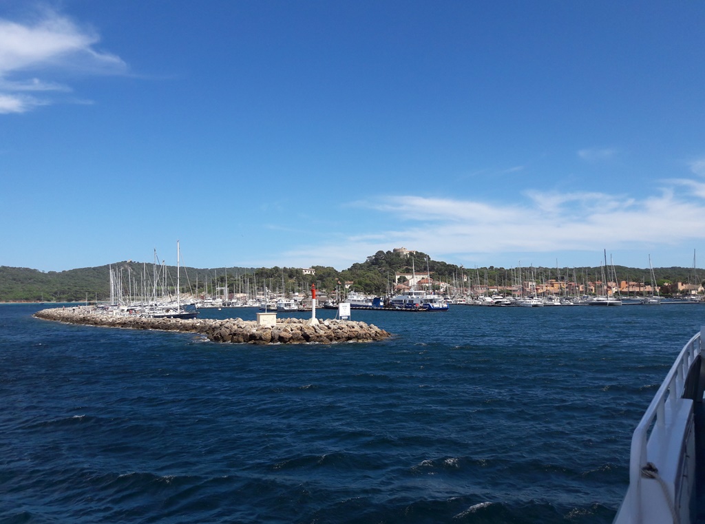 - L’arrivée dans la Rade de Porquerolles : à gauche de la jetée, la Pointe Béarlieu, puis la Plage de la Courtade, et au-dessus des mâts, le Fort Sainte-Agathe construit vers 1531.