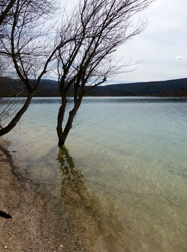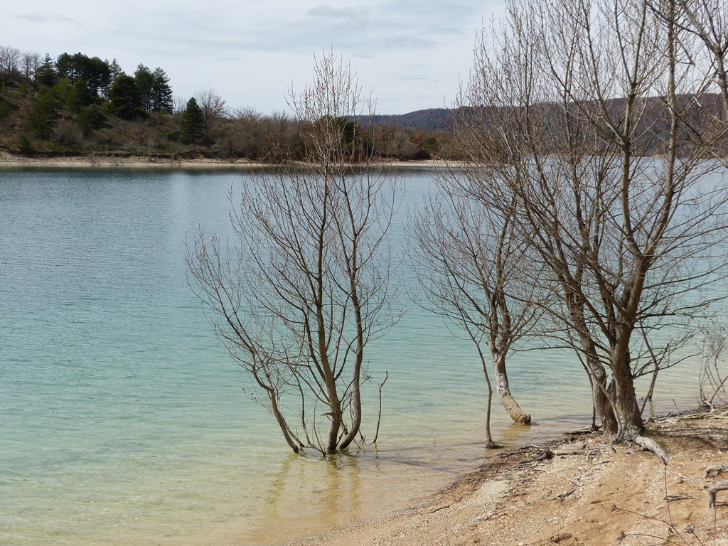 En face, sur la rive opposée, se trouve Bauduen, dans le Var, le lit du Verdon qui passe au milieu du lac marquant la limite entre les deux départements.
