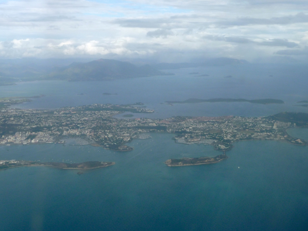 – Au premier plan, à gauche, on voit la Baie de la Moselle (où se trouve la Gare maritime derrière laquelle est située la Place des Cocotiers) protégée par l’Ilot aux Serpents, avec, côté Mer de Corail, l’Anse aux Boeufs. Au milieu, c’est la Baie de l’Orphelinat séparée de l’océan par l’Ilot Brun. A droite, se suivent la Baie des Citrons et la Baie de l’Anse Vata.