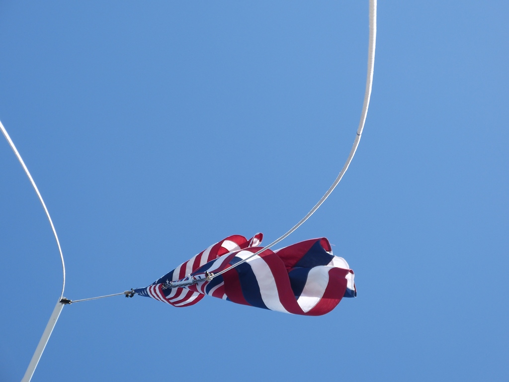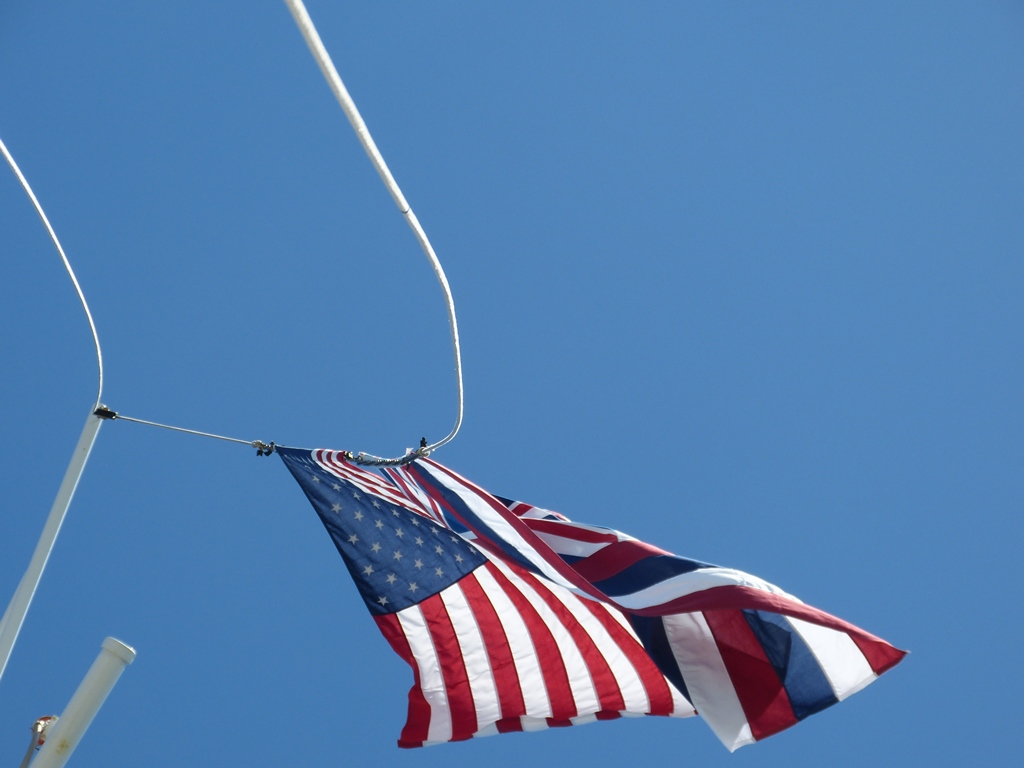 Une sorte de mât est édifié à son sommet, soutenu par des haubans dont l’un supporte les drapeaux respectifs du pays et de l’état.