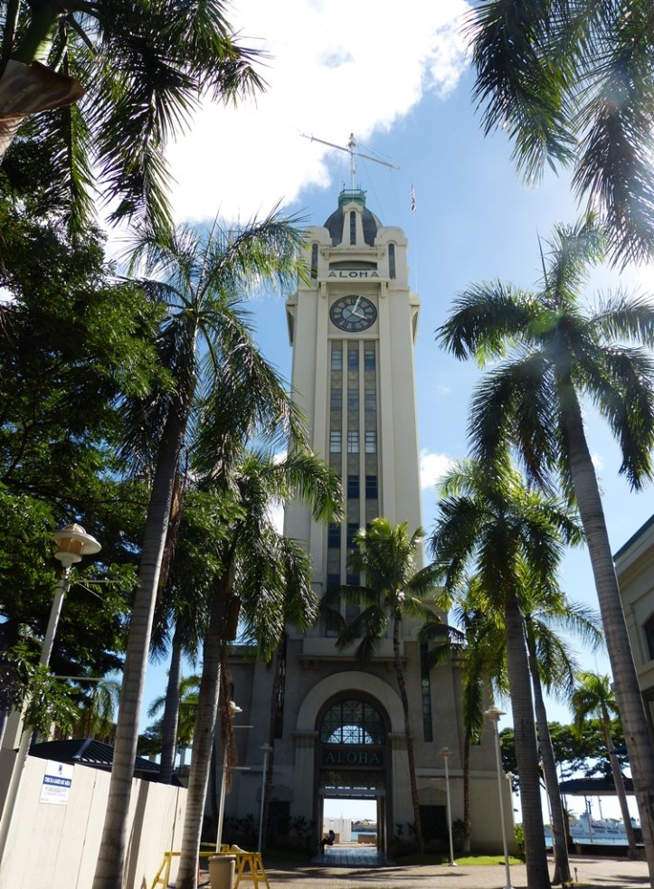 A l’entrée du Port d’Honolulu*, Aloha Tower (située à Downtown) au sommet de laquelle flottent les drapeaux américain et hawaïen, accueille les visiteurs qui descendent des bateaux de croisières en leur souhaitant la bienvenue : Aloha