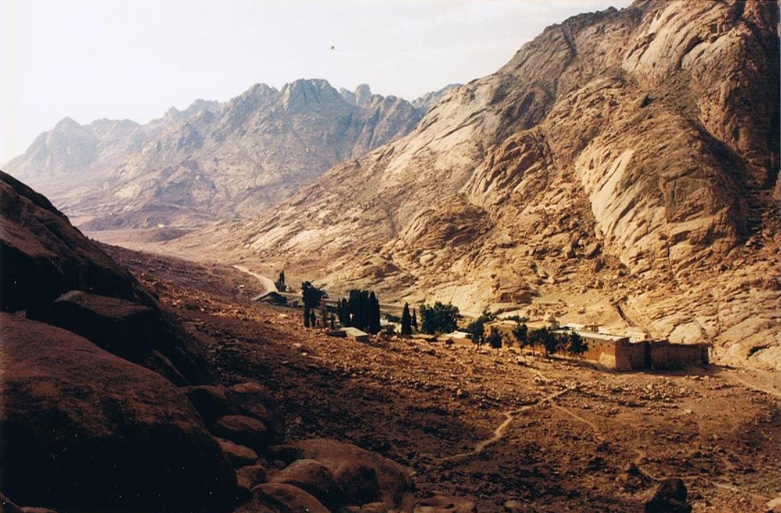 Au nord du Mont Sainte-Catherine (2642 m, le plus haut sommet d’Egypte), à 1570 m d’altitude, le Monastère Sainte-Catherine est situé au pied du Mont Moïse (le second : 2285 m) dans le sud du Désert du Sinaï. Ce dernier forme une péninsule en forme de triangle, limitée au nord par la Méditerranée, à l’ouest par le Golfe de Suez* et à l’est par le Golfe d’Aqaba* (* Mer Rouge).