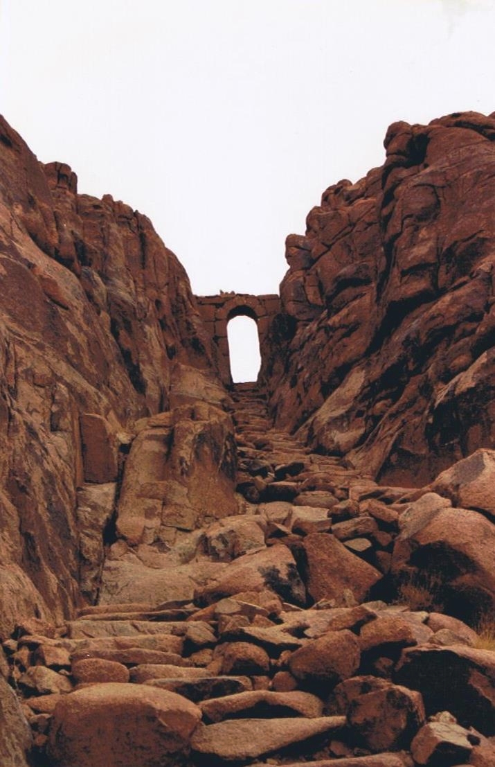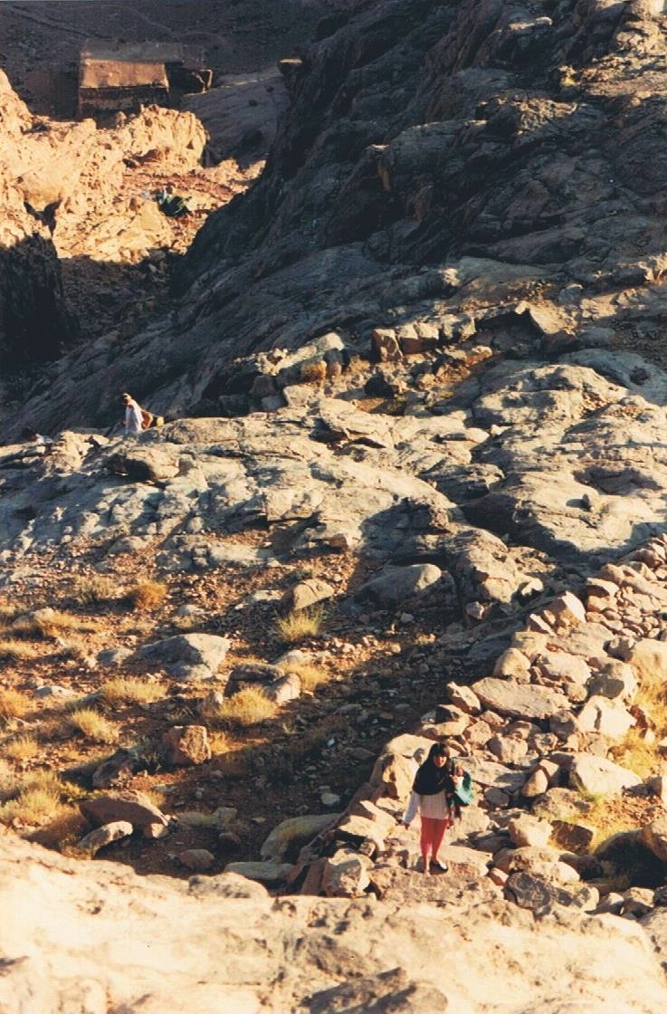 Après une nuit couchés à même le sol, dans le froid nocturne du sommet, nous sommes donc redescendus par l’escalier de plus de 3750 marches appelé Siket Sayidna Musa (le chemin du seigneur Moïse). C’est l’ancienne voie des moines qui l’ont taillé dans une gorge. Elle arrive directement au monastère.