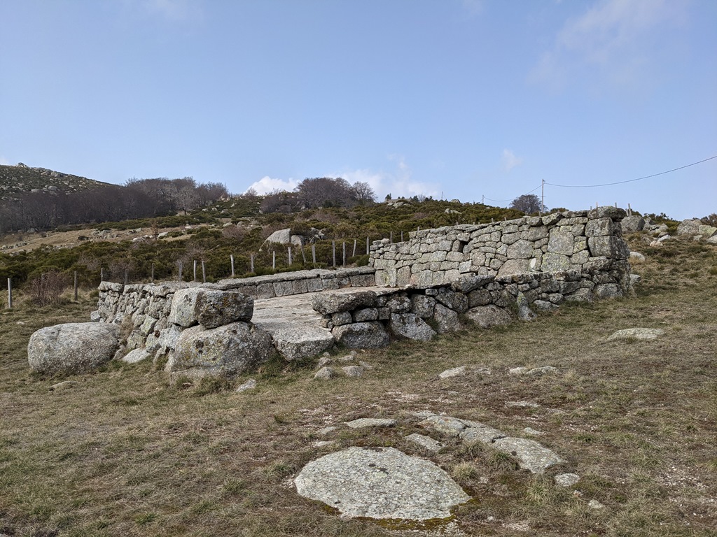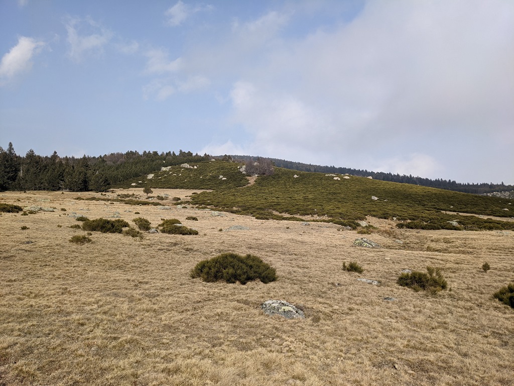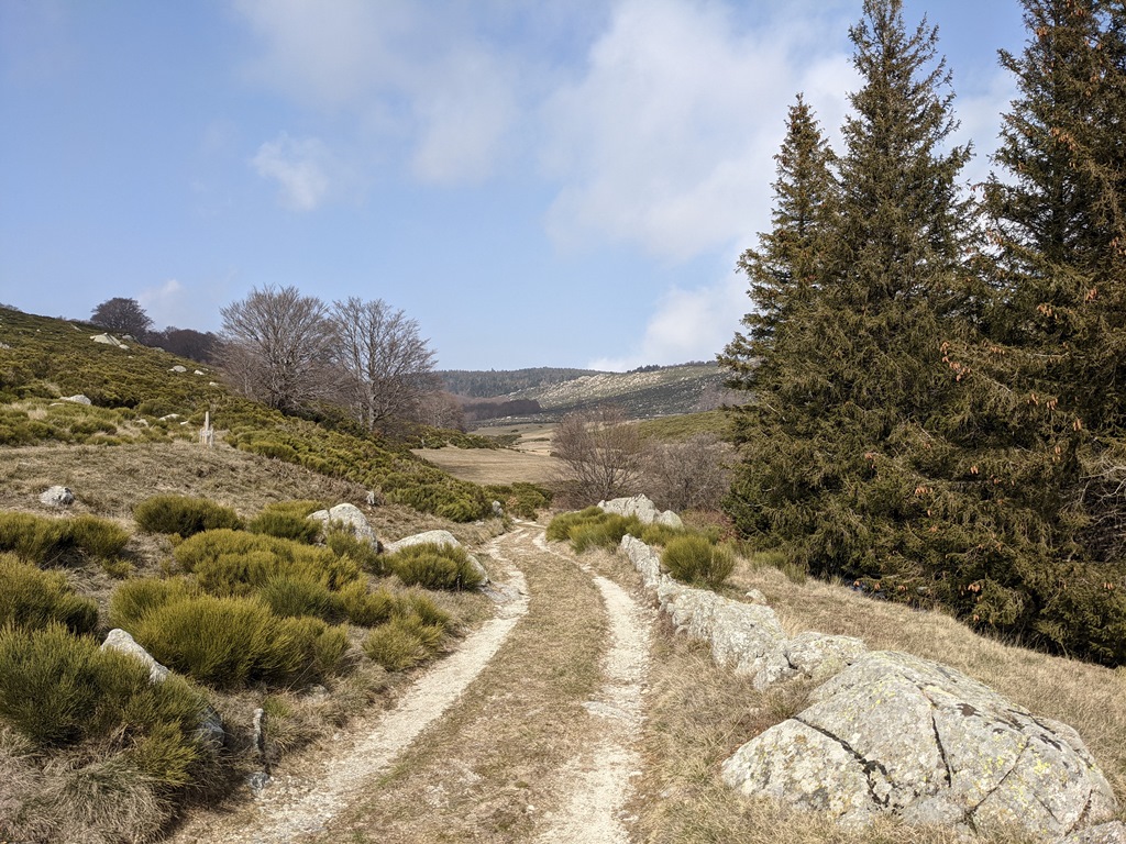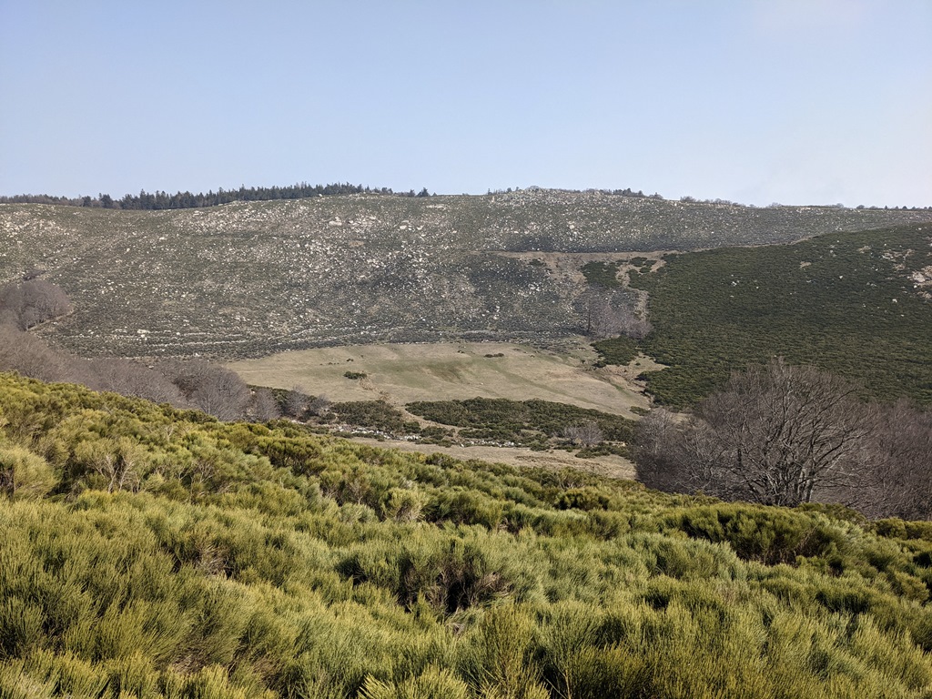 Après avoir quitté la Forêt domaniale du Mont-Lozère, nous avons traversé des pâturages et longé le vallon où coule le ruisseau l’Homol** (la crête boisée au sommet de l’autre versant est sur la commune de Génolhac) avant d’apercevoir le hameau des Bouzèdes.