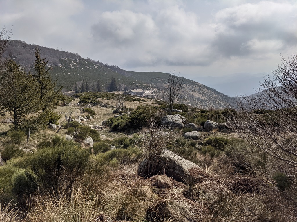 Nous avons effectué la randonnée au départ du Mas de la Barque (extrémité nord de la commune de Vialas*), une station de pleine nature située un peu plus haut, au pied du Pic Cassini (1680 m – deuxième sommet du Mont Lozère et des Cévennes après le le Sommet de Finiels, 1699 m).