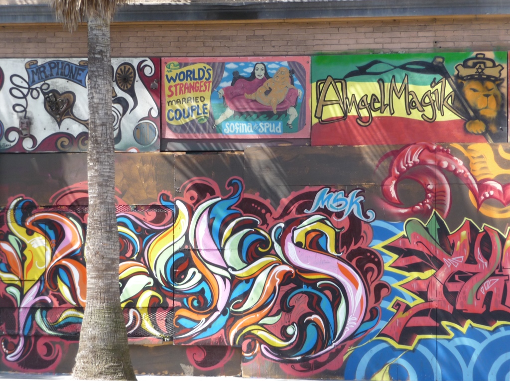 Graffitis sur les murs du Defenestration building* (côté 6th street) dans le quartier de South of Market (SoMa) à San Francisco