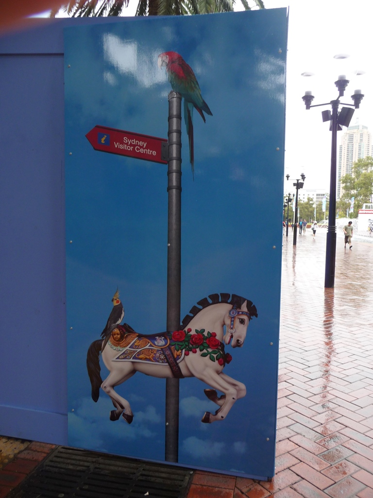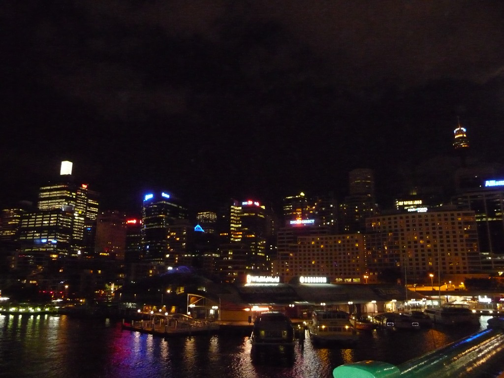 Darling Harbour Woodward Water Feature* puis Cockle Bay et Pyrmont Bridge ; de l’autre côté, l’aquarium (voir plus bas) caché par le pont, Cockle Bay Wharf et les buildings du Central Business District et de The Rocks* : Westpac Place (coin gauche) puis en arrière plan vers la droite, les sommets de Grosvenor Place*, Suncorp Place, et un peu plus loin d’Australia Square Tower, enfin, MLC Center (dans le fond, à droite de l’immeuble bleu avec l’inscription Allianz)