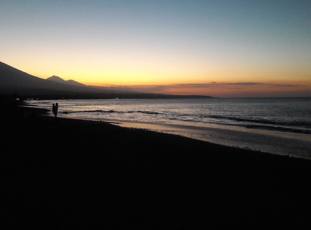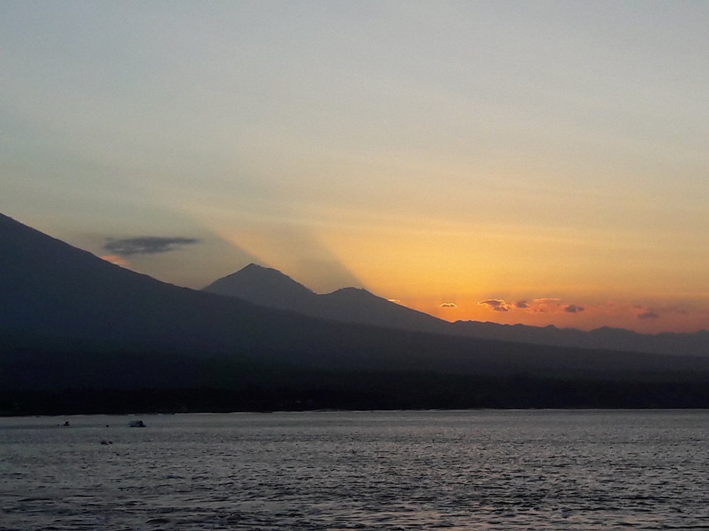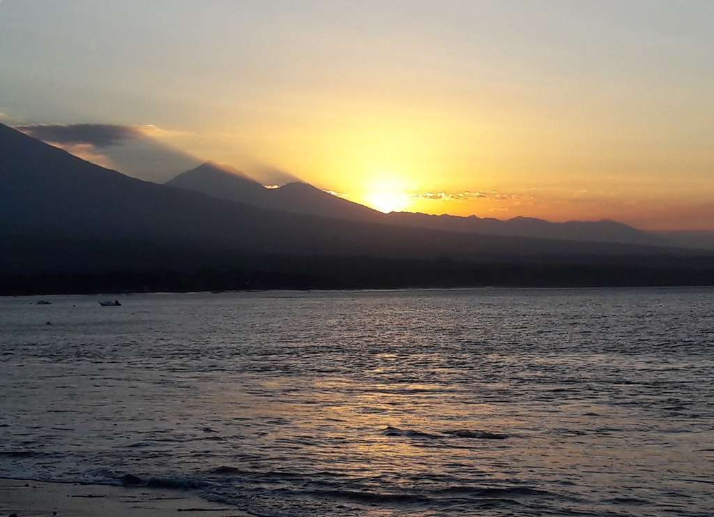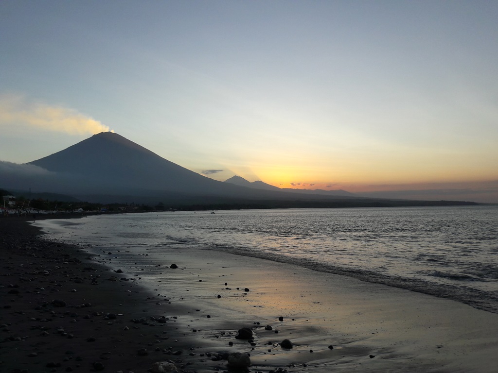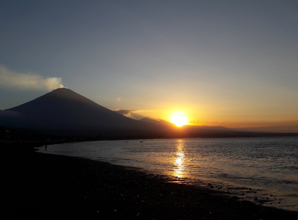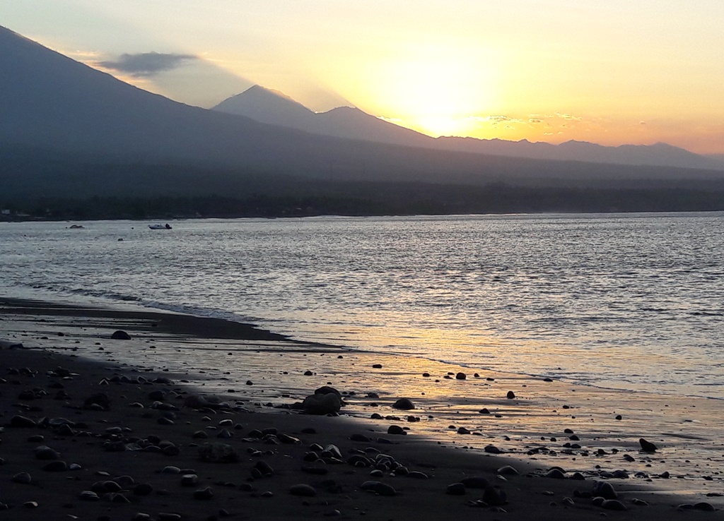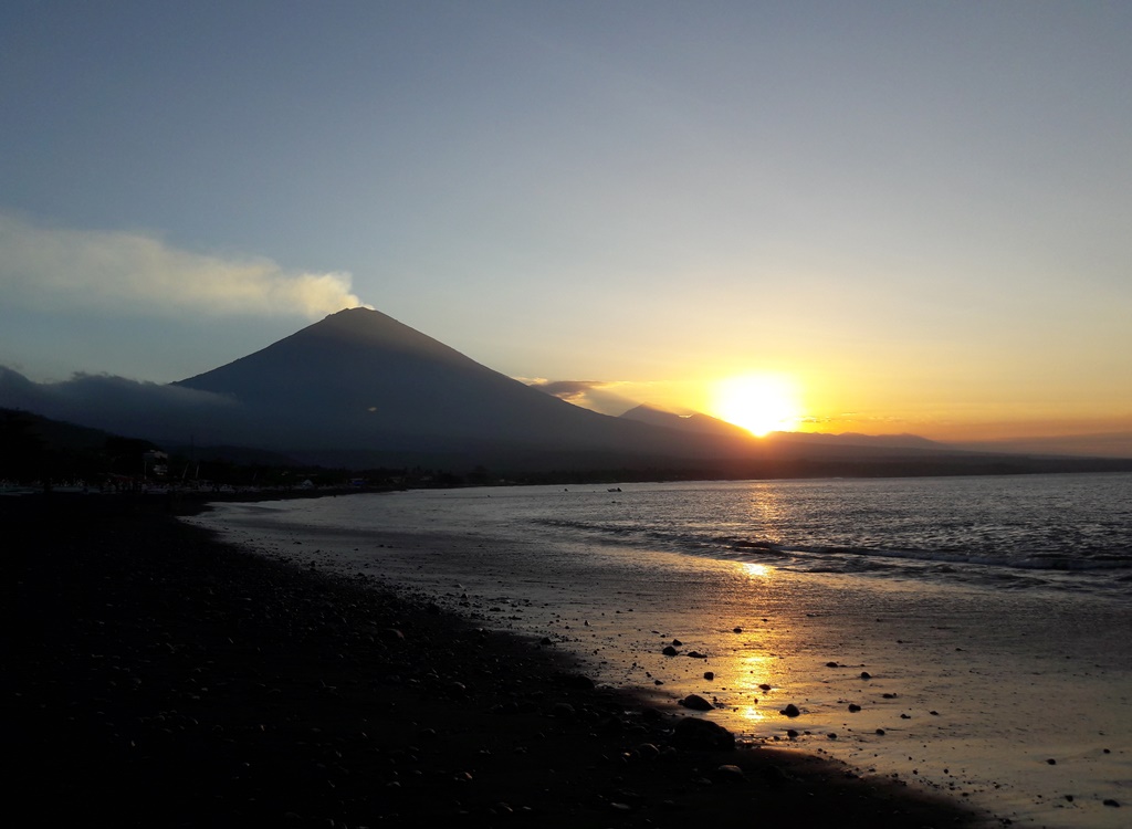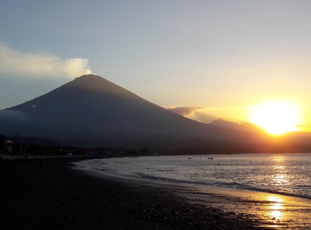 Coucher de soleil depuis la plage d’Amed, dans l’est de Bali, sur les principaux volcans de l’ile située sur la ceinture de feu du Pacifique : Gunung Agung, Gunung Abang et Gunung Batur