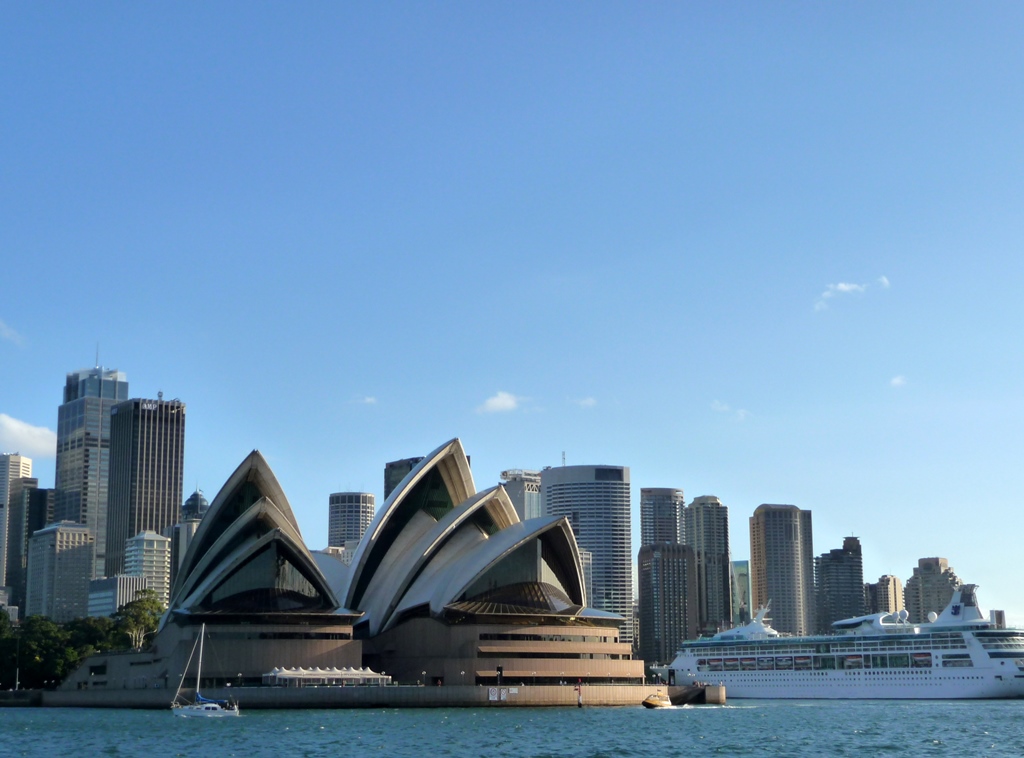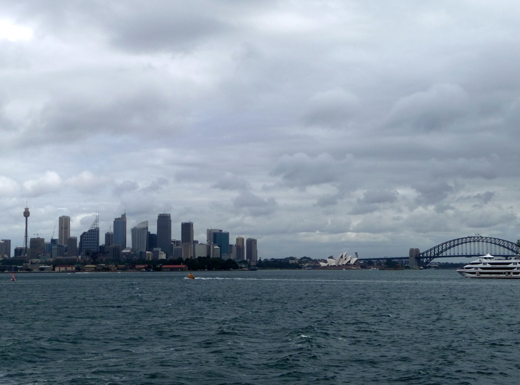 D’ici, la perspective est un peu différente : à gauche de l’opéra et derrière, c’est le CBD , de l’autre côté de l’opéra s’entremêlent le CBD, The Rocks puis Millers Point. Quant au navire, il entre dans Sydney Cove.