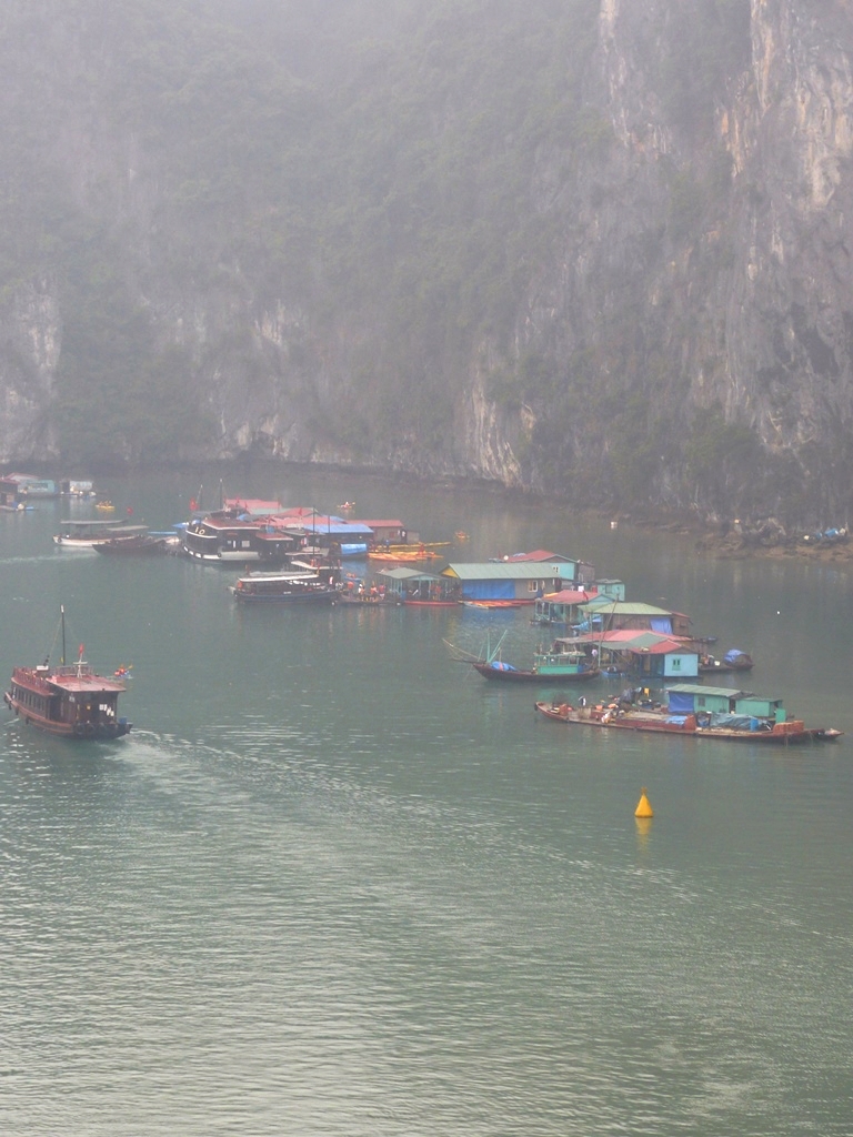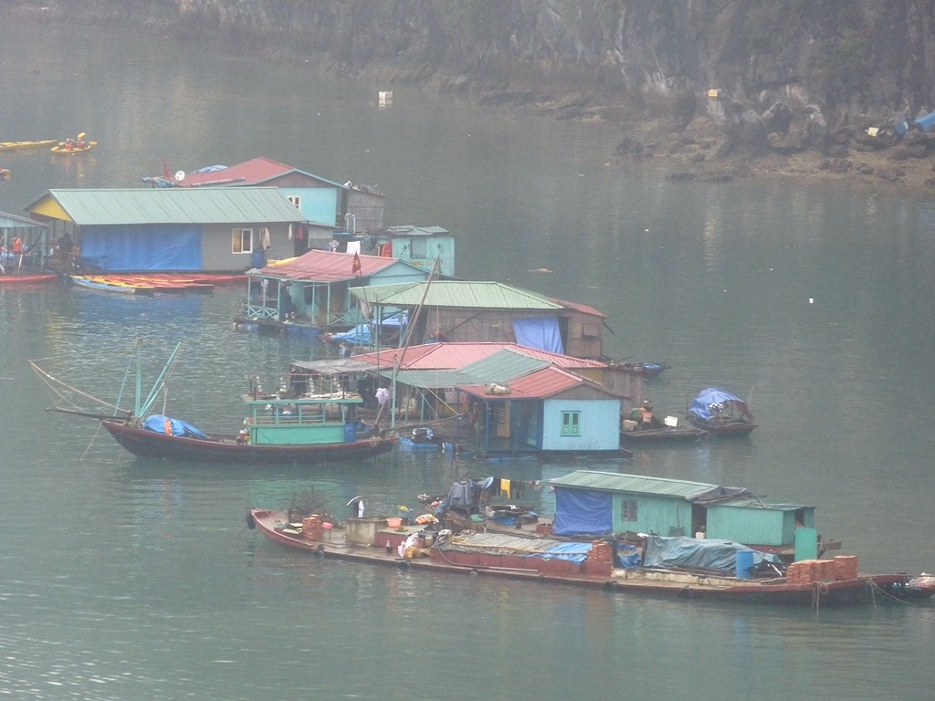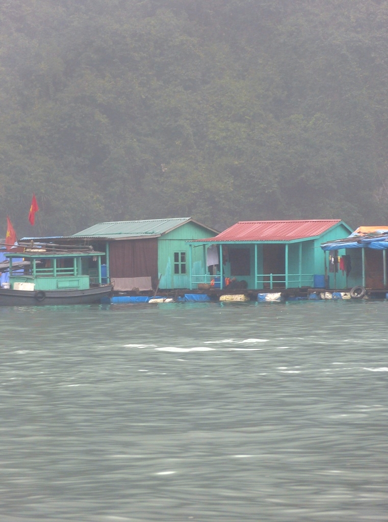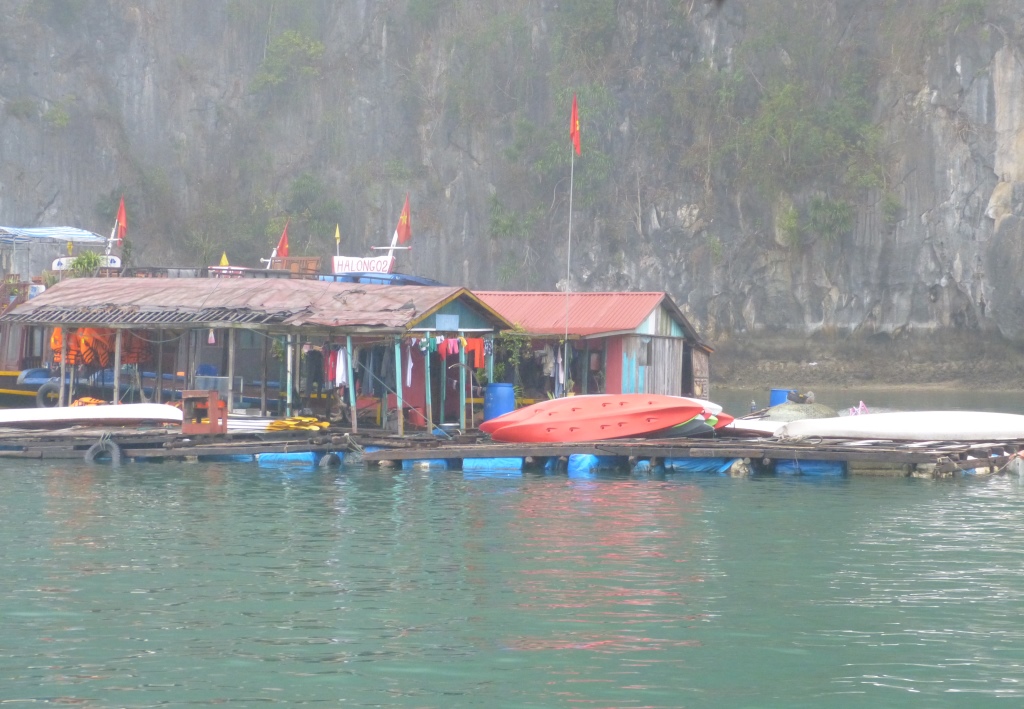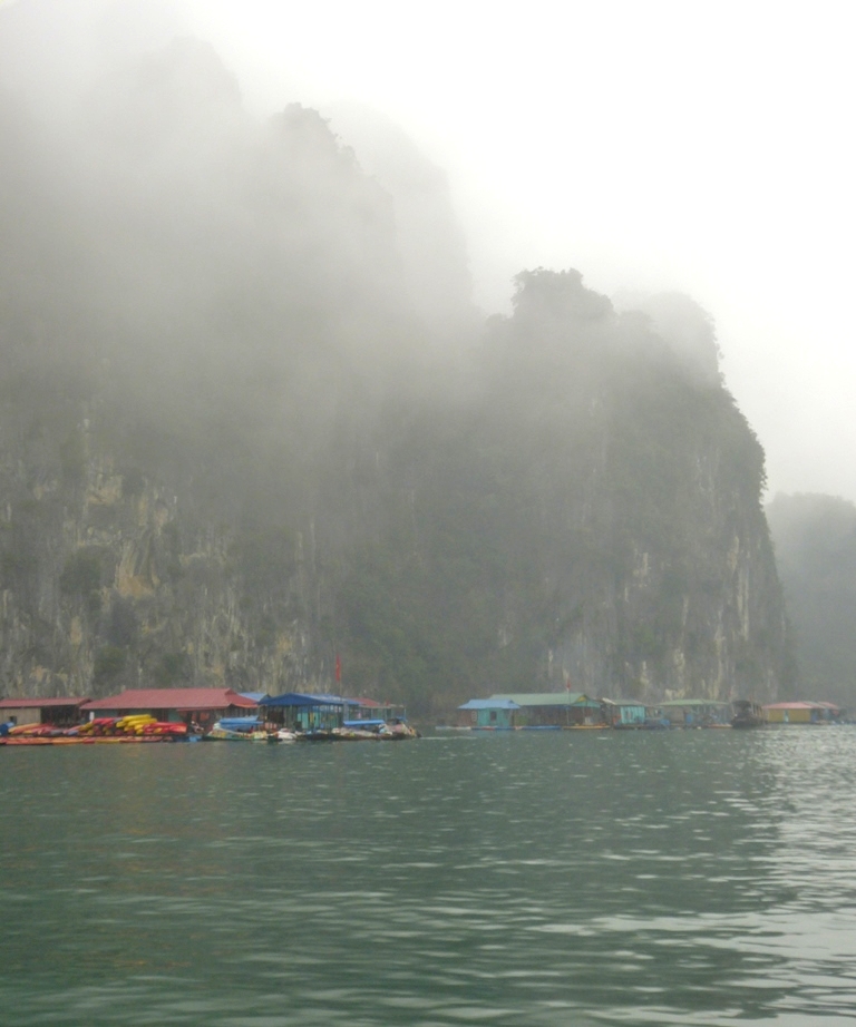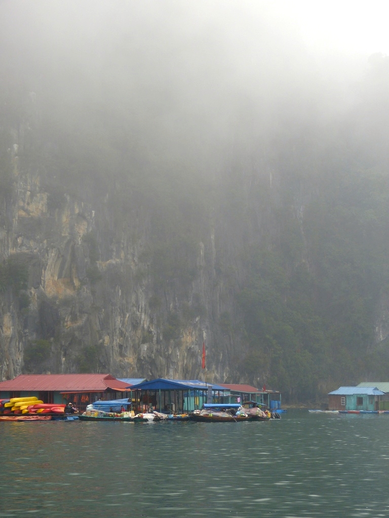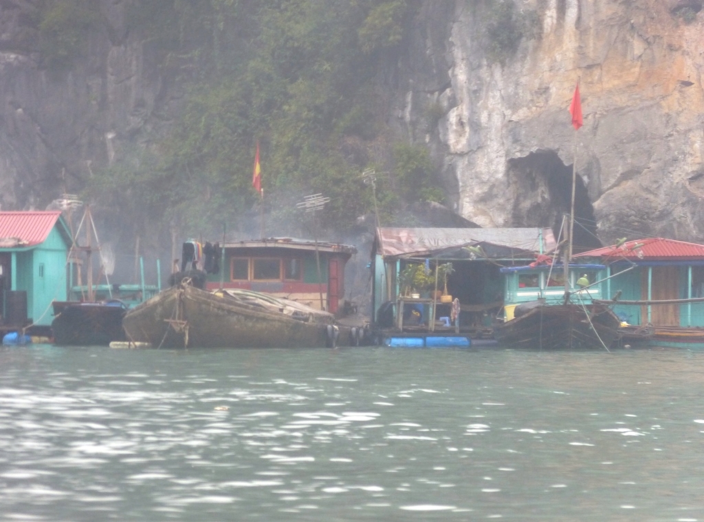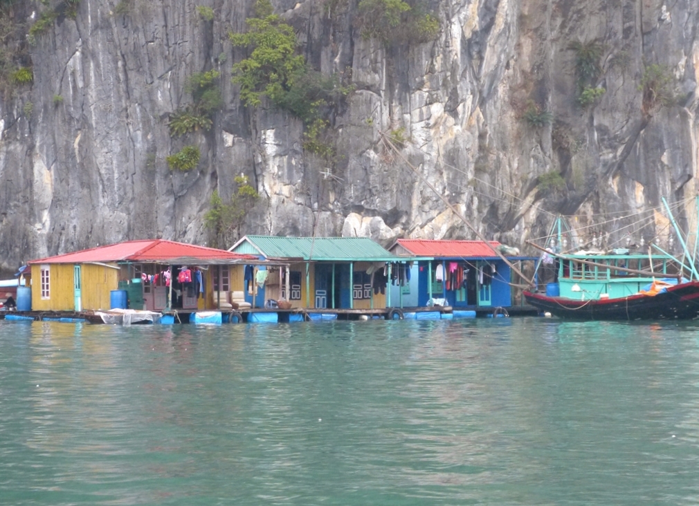 Petit village flottant au pied des falaises de l’Ile de Bo Hon, à proximité de la Grotte de la Surprise (Hang Sửng Sốt)