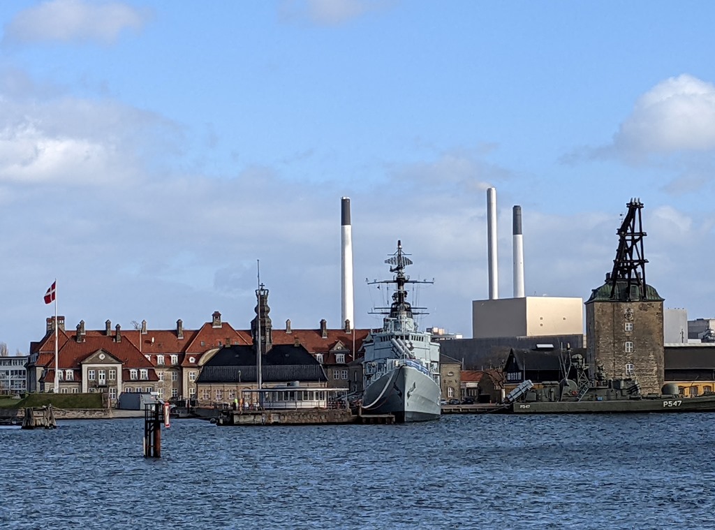 … et Nyholm (la plus au nord) sur laquelle est située la Station navale de Copenhague* (Marinestation København) avec, de gauche à droite : la Søværnets Kaserne (Caserne de la marine), Nyholms Hovedvagt (Garde principale de Nyholm) connue également sous le nom de Under Kronen et Mastekranen (La grue à mât) datant de 1749 qui servait à la construction des voiliers.