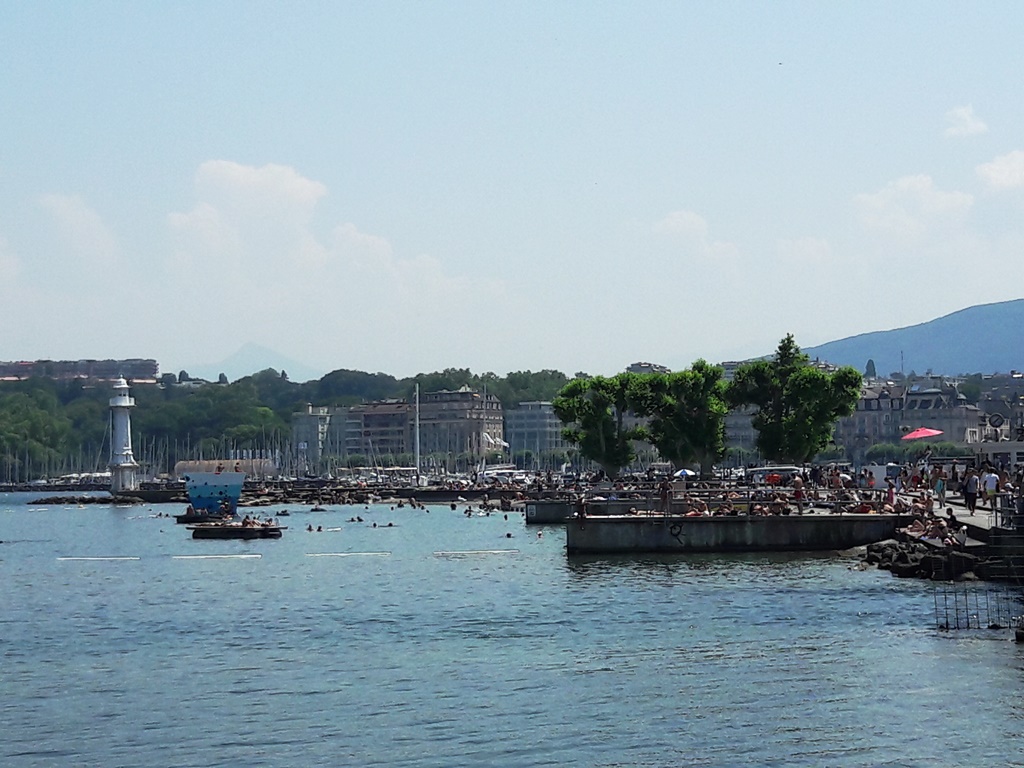 Du côté du Quai du Mont-Blanc* se trouve le Bain des Pâquis, construits en 1872, sur la Jetée des Pâquis. Au bout, on voit le Phare des Pâquis.