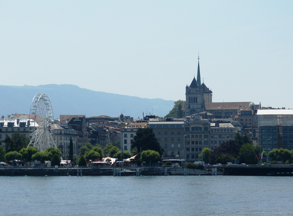 En face, sur la Rive gauche, au niveau de l’exutoire du Rhône qu’enjambe le Pont du Mont-Blanc (1902-1903), on voit le Jardin Anglais* où se trouve la fameuse Horloge Fleurie.