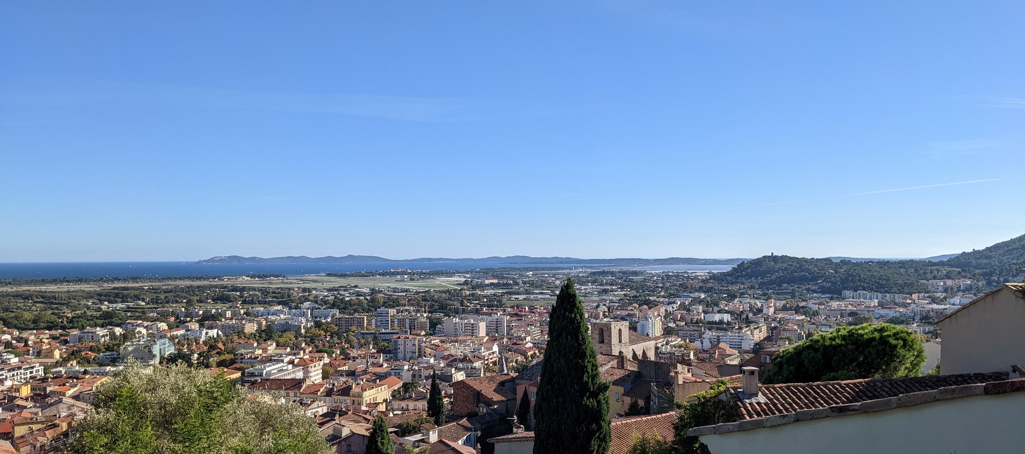 Vers l’est (à gauche), on distingue les Vieux Salins, le Massif des Maures et l’Ilot de Brégançon,