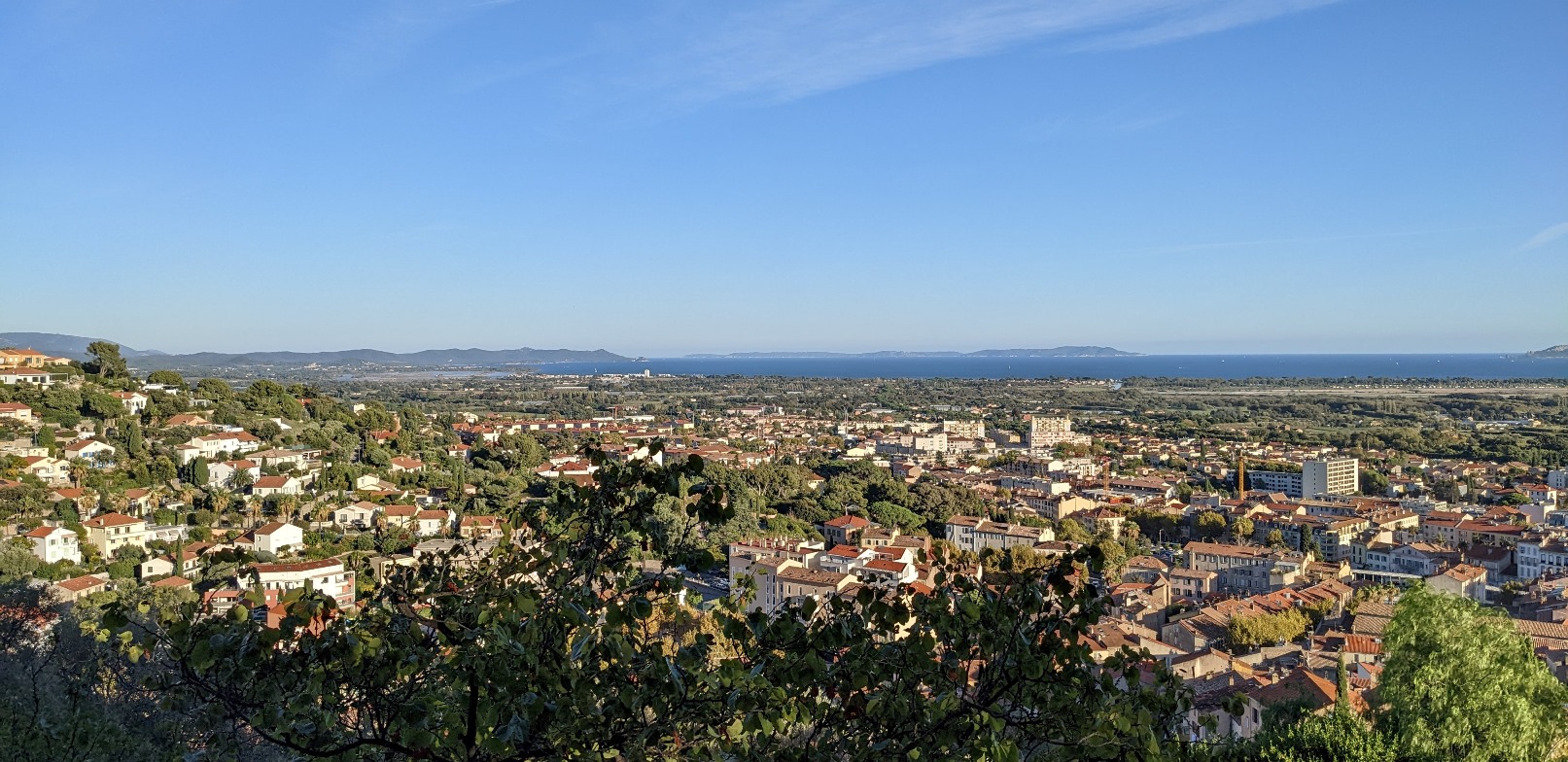 – Au second plan, à droite, le clocher de la Chapelle Notre-Dame-de-Consolation sur la Colline de Costebelle (elle forme un quartier de la ville), qui domine le Salin des Pesquiers, puis le versant oriental du Mont des Oiseaux (à cheval sur Hyères, et Carqueiranne du côté ouest) ;