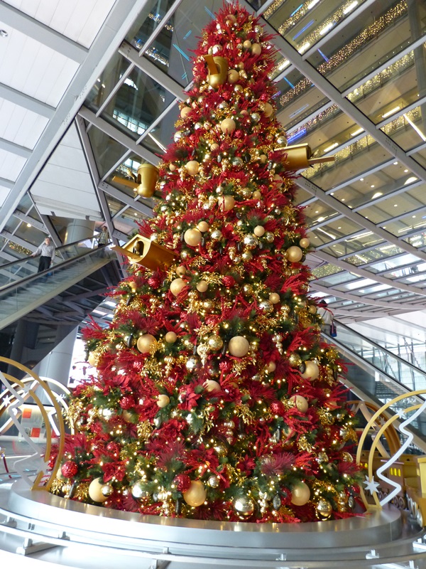 L’entrée du bâtiment est formée d’une place couverte, décorée ici par un arbre de Noël, qui permet d’accéder à un atrium de 10 étages par deux grands escalators.
